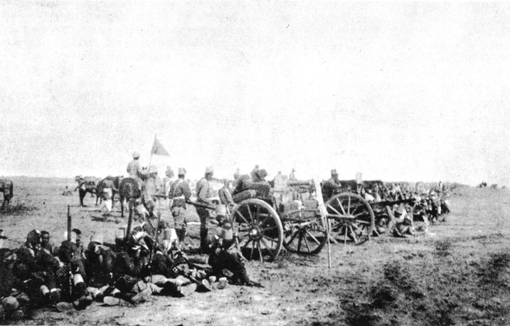 The battle of Omdurman began at 5.30 a.m. with a salvo of six guns from Major Elmslie’s battery on the east Nile bank. They were fired from the 5-inch howitzers, which sent a half-dozen of 50-lb. Lyddite shells hurtling around the tomb and the Khalifa’s quarters. Like a spouting volcano, clouds of flame, stones, and dust burst from out the city. The line of strong forts before the town and upon Tuti island had been silenced by them and the gunboats the previous day. Although the dervishes had built stout works, and had plenty of cannon and ammunition, they made a wretchedly bad stand against the gunboats, injuring none of them. The overpowering weight as well as the accuracy of our steamers’ fire ended the naval part of the battle almost as soon as it was begun. Quick-firers and Maxims were trained to bear into the embrasures of the Khalifa’s forts. As a consequence, the enemy’s gunners were only able to fire a few wild rounds at the vessels. Jealous and suspicious of everyone, Abdullah left his arsenal full of unemployed batteries, Krupps, and machine guns, and only took three of either of the latter weapons with him into the field against us. After the labour too of taking them there, he made but little use of them. As I learned, the Greeks, some thirty-five, and all able-bodied men, had to march out of Omdurman and follow the Khalifa to battle. I by no means, I think, over-estimate the enemy’s numbers when I state that there were 50,000 dervishes of sorts who advanced against us, sworn to leave not a single soul alive in the Sirdar’s army. Abdullah, professedly sanguine of success, had bade the mollahs and others attend him at noon prayers in the mosque and Mahdi’s tomb, where he would go to worship immediately after his victory. He had returned into town, and spent part of the night of 1st and 2nd September in his own house.