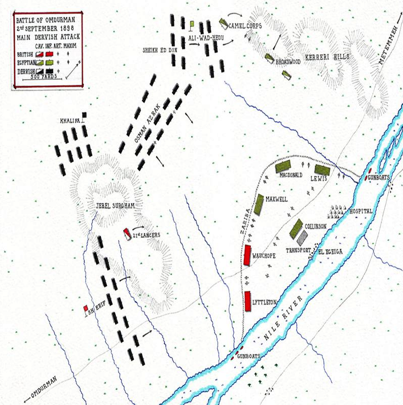 It was 3.40 a.m. on 2nd September when the bugles called the 22,000 men of the Sirdar’s army from slumber. Quickly the troops were astir, and the camp full of bustling preparation. It was given out that we were not to move forward quite as early as usual. But circumstances alter cases, and very soon loads and saddles were adjusted with extra care. Everything was made as trim as possible, and belts were buckled tightly for action. There was a sense and expectancy of coming battle abroad, and an eager desire permeating all ranks to have it out with the dervishes then or never. It had come at length to be generally accepted that the enemy would not bolt nor slip through our fingers, but would accept the gage of battle which the Sirdar meant shortly to give him. We were going to march out, attack, and storm the Khalifa and his great army in their chosen lines and trenches. In a way we felt half-heartedly grateful to our sportsmanlike enemy for not having harassed our marches or bivouacs. We were, within the next hour or so, to have yet more to thank the dervishes and their Khalifa for. Truly Abdullah was amazingly ignorant of war tactics, or astoundingly confident in the prowess of his arms. From the reckless, magnificent manner in which the dervishes comported themselves in the earlier stages of the fight that ensued, I incline to the belief that the Khalifa and his men, true to their crass, credulous notions, were overweeningly confident in themselves. A fatal fault, they underrated their opponents. His Emirs, Jehadieh, and Baggara had so often proved themselves invincible in their combats against natives of the Soudan, that they had come to hold that none would face their battle shock. There was pride of countless triumphs, and the long enjoyment of despotic lordship that hardened their wills and thews to win victory or perish. I failed later to see the old fanaticism that once made them, though pierced through and through with bayonet or sword, fight till the last heart-throb ceased. Let me not be misunderstood. Despite their possible doubts about the Khalifa’s divine mission, the dervish army fought with courage and dash until they were absolutely broken. Their personal hardihood bravely compared with the days of Tamai and Abu Klea. It was when the fight was nearly over that there were evidences of that of which there was so little in the old days, viz., that a large remnant would accept life at our hands. Again, as the sequel showed, the Sirdar’s star was in the ascendant.