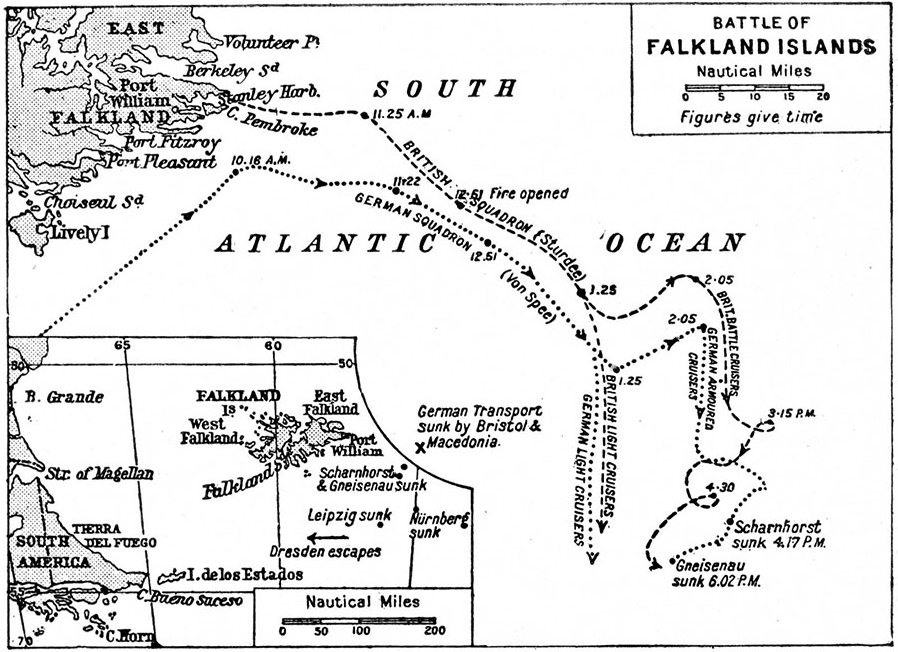 It was now twenty minutes past ten, and the character of the future action was already determined. For the Germans it had become instantly clear that their only hope—if such it might be called—lay in flight; and, on the British side, the order had been signalled for a general chase at full speed. Gathering pace, the two battle-cruisers from the north soon overtook and outstripped the Carnarvon and Kent, the position at eleven o’clock, with the squadron as a whole making about 20 knots, being as follows—the Glasgow was still leading, but had been ordered to remain within two miles of the flagship Invincible; next came the Invincible herself, with her decks flooded by hoses to prevent fire and wash away the last of the coal-dust; the Inflexible followed behind her, on her starboard quarter, with the Kent falling away from her astern and aport, followed by the Carnarvon, with the faster Cornwall reluctantly obeying orders to remain upon her quarter. Left behind in the harbour were the Bristol and Macedonia; but, just at this moment, on the other side of the island, a lady watcher at Fitz Roy, Mrs. Roy Felton, had seen and reported three other German vessels. Two of these—the third made its escape—were the colliers, already familiar to us, the Santa Isabel and Baden. The coal on board these vessels had been obtained from various sources since the action off Coronel, some from the Valentino, a French prize, and some from the British vessel Drummuir, captured on December 2d; and the Bristol and Macedonia were at once ordered by Admiral Sturdee to deal with them. Between nine and ten miles to the south, on a course east-north-east, von Spee in the Scharnhorst was travelling at full speed, followed by the Dresden, the Gneisenau, the Nürnberg, and the Leipzig, in the order named.