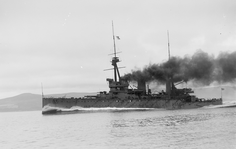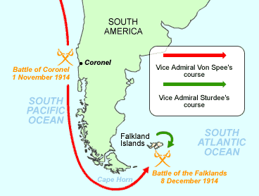Laying a chain of mines at the entrance to Port William, the Canopus was put aground in the inner harbour, whence, protected by the land, she would be able to fire her big shells out to sea; her smaller guns were converted into batteries, mounted in strategic positions among the surrounding hills. Meanwhile in England, under Lord Fisher, who had been recalled to the Admiralty as First Sea Lord, secret and decisive measures had been instantly adopted. Within ten days of the Battle of Coronel, by an act of the same genius that had created them, the Invincible and Inflexible—two of our earlier, but still very powerful battle-cruisers, each capable of a speed of 27 knots and carrying eight 12-inch guns—had been detached from the Grand Fleet, coaled and munitioned, and, under Vice-Admiral Sir Doveton Sturdee, were steaming toward the equator, unknown to the world, to avenge Sir Christopher Cradock and his lost crew.