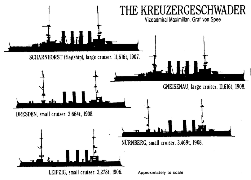 These conditions were first brought about when, at twenty minutes past one, the Leipzig turned away toward the southwest, soon to be followed by the Nürnberg and Dresden, with the Glasgow, Kent, and Cornwall in pursuit. With them had started the Carnarvon, but the rear-admiral in command of her, finding his speed insufficient to keep up with the light cruisers, had to give up the chase, and joined the Invincible and Inflexible in engaging the Scharnhorst and Gneisenau. Leaving the action of the smaller cruisers in the capable hands of Captain Luce of the Glasgow, let us follow the fortunes of the other three in the most immediate and important task. Of these the ten-year-old Carnarvon, pushing on as stoutly as she could, was still trying vainly to keep up with her swifter sisters; and the first encounter was reduced, therefore, to a four-cornered fight lasting for about fifty minutes.