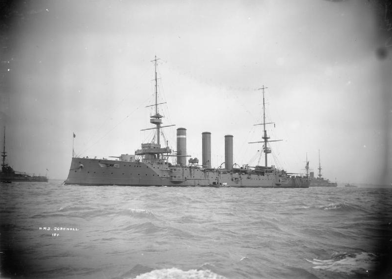 We have last seen the Cornwall, not wholly to her liking, upon the quarter of the even slower Carnarvon; but, a little after noon, to her great satisfaction, she had received orders to go ahead. When the three light cruisers had broken to the south in their endeavour to escape, she had turned after them, as we have said, with her sister ship, the Kent, in the wake of the nimbler Glasgow. Now, thanks to the Glasgow and the superhuman efforts of their two engine-room staffs, both the Kent and Cornwall were at last in action, the former being ordered in pursuit of the Nürnberg—where we may leave her for a moment performing imperishable conjuring-tricks in the way of stoking and engine-driving, while her luckier consorts, already at close grips, were battering the Leipzig to pieces.