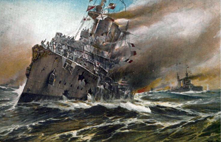 What her condition was then has been vividly described by Private Whittaker of the Royal Marine Light Infantry. “When we went right close,” he wrote to his mother, “she looked just like a night-watchman’s fire bucket, all holes and fire.” Searchlights were now playing upon her through the rain and darkness, but, in view of possible explosions, the boats could not approach too near; out of her crew of over three hundred, less than a score were saved; and, at just about nine o’clock, she rolled over to port, seemed to recover a moment, and then slipped out of sight.