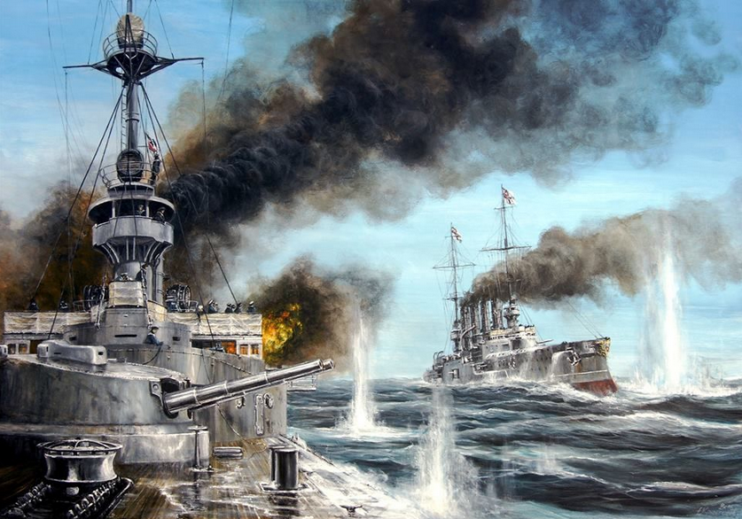 It was at five minutes to one, at a range of about nine miles, that the first shot was fired by the Inflexible, taking for her target the light cruiser Leipzig, the last vessel of von Spee’s line. Five minutes afterward the Invincible followed suit, also taking the Leipzig for her target; and soon afterward the battle resolved itself into three separate encounters—that between the Invincible, Inflexible, and Carnarvon, and the Scharnhorst and Gneisenau; that between the Glasgow and Cornwall, and the Leipzig; and finally, after an epic chase, that in which the Kent overtook and sank the Nürnberg.