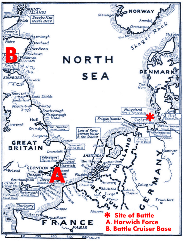 On the 28th of August came the battle off the Bight of Heligoland. The island of Heligoland had been a British possession from 1807 till 1890, when it was transferred to Germany by treaty. It was seen immediately by the Germans that it formed an excellent natural naval base, lying as it does, thirty-five miles northwest of Cuxhaven and forty-three miles north of Wilhelmshaven. They at once began to augment the natural protection it afforded with their own devices. Two Zeppelin sheds were erected, concrete forts were built and 12-inch guns were installed. The scene of the battle which took place here was the Bight of Heligoland, which formed a channel eighteen miles wide some seven miles north of the island and near which lay the line of travel for ships leaving the ports of the Elbe.