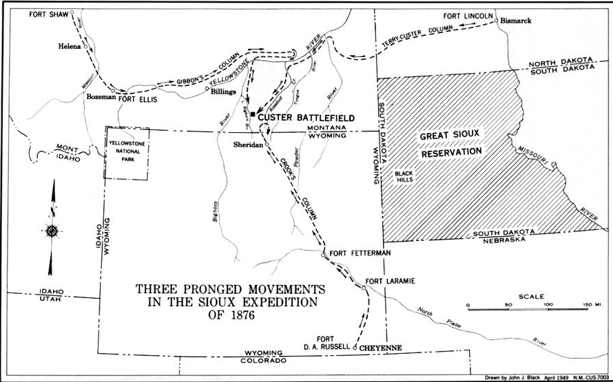 Three expeditions were planned for the winter, which were to be launched upon the Indians simultaneously. One, under General Gibbon, was to come eastward from western Montana; another, under General Crook, was to advance northward from southern Nebraska; and the third, under Custer, was to strike westward from Fort Lincoln. It was believed that any one of the three, each of which comprised more than a thousand men, would be strong enough to defeat the Indians, the only problem being to catch them or corner them.