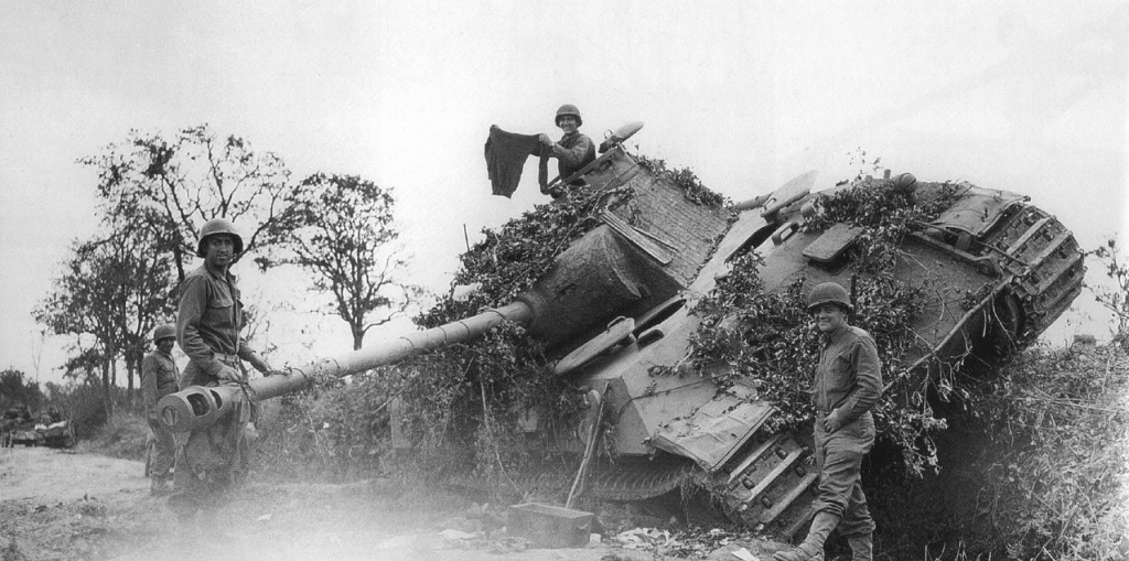 Soon it became apparent, even to the non-professional observer, that the Wehrmacht had suddenly collapsed. That was the meaning of the wrecked farm carts. As Patton’s armor poured through the Avranches gap, sliced across the German lines to the south, overran their outposts, crushed their headquarters under tank tracks, and attacked their field positions from the rear, the Germans, as a last resort, stole every vehicle from the countryside, from horse-traps to wheelbarrows, and ran away. They threw their belongings into these decrepit wooden carts, and started — some times south, sometimes west or east — without direction or guidance and finally without discipline.