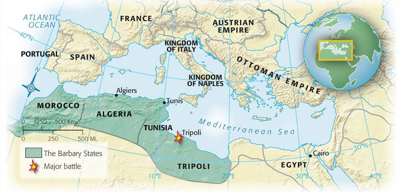 It is difficult to conceive that there ever was a time when the United States paid a money tribute to anybody. It is even more difficult to imagine the United States paying blackmail to a set of small piratical tribes on the coast of Africa. Yet this is precisely what we once did with the Barbary powers, as they were called the States of Morocco, Tunis, Tripoli, and Algiers, lying along the northern coast of Africa. The only excuse to be made for such action was that we merely followed the example of Christendom. The civilized people of the world were then in the habit of paying sums of money to these miserable pirates, in order to secure immunity for their merchant vessels in the Mediterranean. For this purpose Congress appropriated money, and treaties were made by the President and ratified by the Senate. On one occasion, at least, Congress actually revoked the authorization of some new ships for the navy, and appropriated more money than was required to build the men-of-war in order to buy off the Barbary powers. The fund for this disgraceful purpose was known as the “Mediterranean fund,” and was intrusted to the Secretary of State to be disbursed by him in his discretion. After we had our brush with France, however, in 1798, and after Truxtun’s brilliant victory over the French frigate L’Insurgente in the following year, it occurred to our government that perhaps there was a more direct as well as a more manly way of dealing with the Barbary pirates than by feebly paying them tribute, and in 1801 a small squadron, under Commodore Dale, proceeded to the Mediterranean.