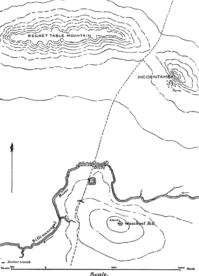 After an uneventful round, I directed my steps back towards the thin blue threads of smoke, rising vertically in the still air, which alone showed the position of my little post, and as I walked the peacefulness of the whole scene impressed me. The landscape lay bathed in the warm light of the setting sun, whose parting rays tinged most strongly the various heights within view, and the hush of approaching evening was only broken by the distant lowing of oxen, and by the indistinct and cheerful hum of the camp, which gradually grew louder as I approached. I strolled along in quite a pleasant frame of mind, meditating over the rather curious names which Mr. Brink had given me for the surrounding features of the landscape. The kopje above his farm was called Incidentamba, the flat-topped mountain some two miles to the north was called Regret Table Mountain, and the gently rising hill close to the drift on the south of the river was called Waschout Hill. Everything was going on well, and the men were at their teas when I got back. The nice Dutchman, with his apostolic face, and the lanky Piet and Gert, were already there, surrounded by a swarm of men, to whom they were selling their wares at exorbitant rates. The three of them strolled about the camp, showing great interest in everything, asking most intelligent questions about the British forces and the general position of affairs, and seemed really relieved to have a strong British post near. They did not even take offence when some of the rougher men called them “blarsted Dutchmen,” and refused to converse with them, or buy their “skoff.” About dusk they left, with many promises to return with a fresh supply on the morrow.