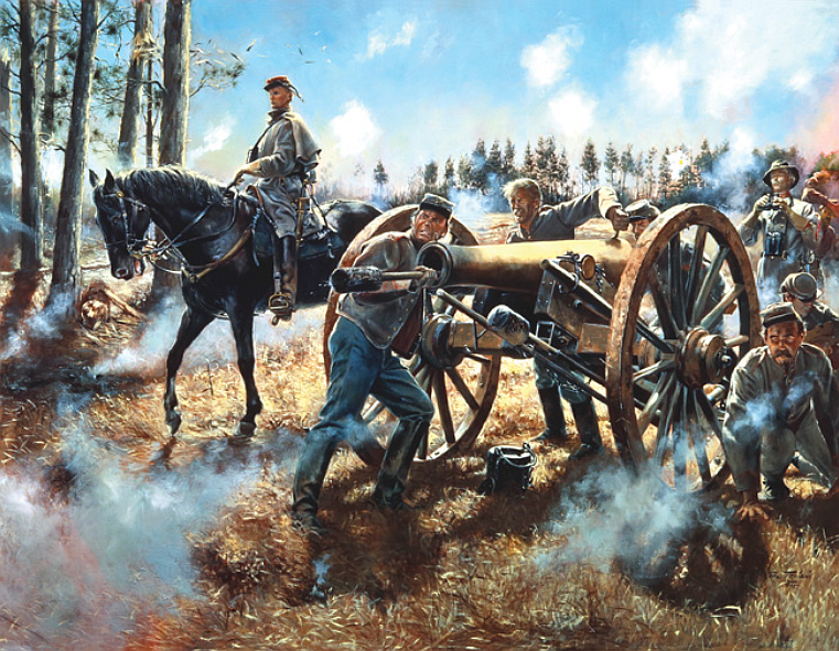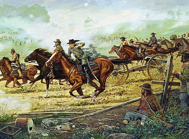Pelham’s first taste of war was at the first battle of Manassas, where his skill was so conspicuous and his courage was so daring as to attract the attention and admiration of the commanders of the army. This was followed by a commission to raise a battery of six pieces of horse artillery, which he proceeded to do during the months immediately following the July in which the first great battle of the war was fought. His battery was rapidly gotten into admirable shape, and he was soon ready for effective service.
