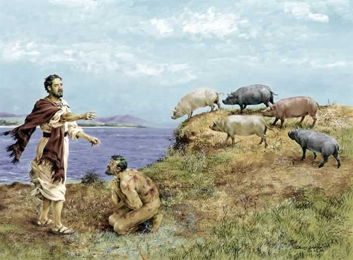 26 And they arrived at the country of the Gerasenes, which is over against Galilee. 27 And when he was come forth upon the land, there met him a certain man out of the city, who had demons; and for a long time he had worn no clothes, and abode not in any house, but in the tombs. 28 And when he saw Jesus, he cried out, and fell down before him, and with a loud voice said, What have I to do with thee, Jesus, thou Son of the Most High God? I beseech thee, torment me not. 29 For he was commanding the unclean spirit to come out from the man. For often-times it had seized him: and he was kept under guard, and bound with chains and fetters; and breaking the bands asunder, he was driven of the demon into the desert. 30 And Jesus asked him, What is thy name? And he said, Legion; for many demons were entered into him. 31 And they entreated him that he would not command them to depart into the abyss. 32 Now there was there a herd of many swine feeding on the mountain: and they entreated him that he would give them leave to enter into them. And he gave them leave. 33 And the demons came out from the man, and entered into the swine: and the herd rushed down the steep into the lake, and were drowned. 34 And when they that fed them saw what had come to pass, they fled, and told it in the city and in the country. 35 And they went out to see what had come to pass; and they came to Jesus, and found the man, from whom the demons were gone out, sitting, clothed and in his right mind, at the feet of Jesus: and they were afraid. 36 And they that saw it told them how he that was possessed with demons was made whole. 37 And all the people of the country of the Gerasenes round about asked him to depart from them; for they were holden with great fear: and he entered into a boat, and returned. 38 But the man from whom the demons were gone out prayed him that he might be with him: but he sent him away, saying, 39 Return to thy house, and declare how great things God hath done for thee. And he went his way, publishing throughout the whole city how great things Jesus had done for him.