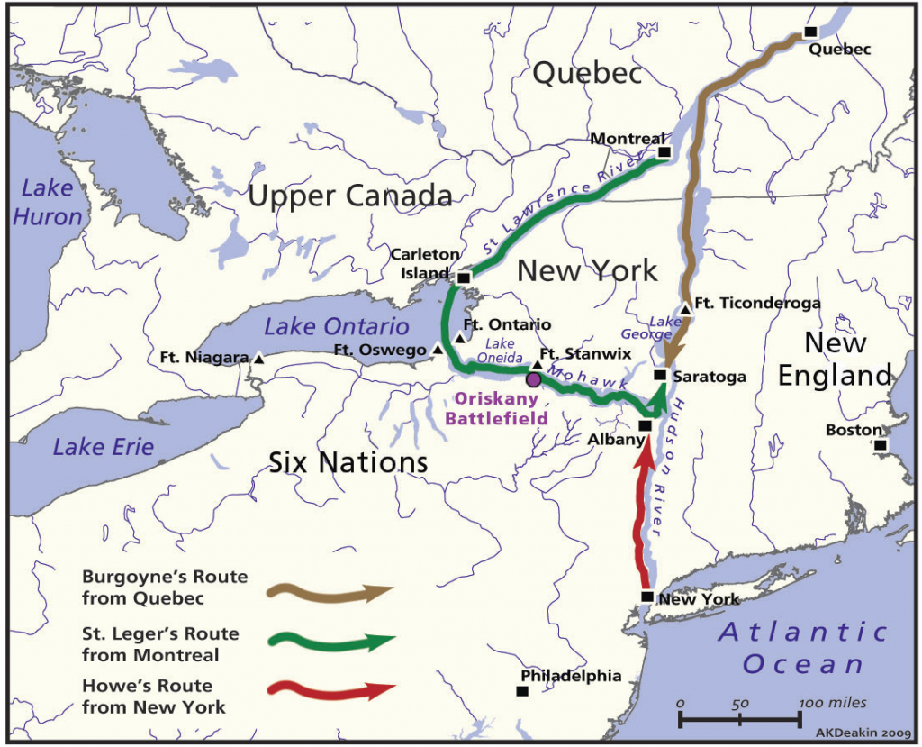 It was in the Mohawk Valley, back in 1777. The Tories and Indians were devastating the homes of the American patriots. Down the valley swept St. Leger, with his strange army under the British flag, loyalist Tory and aborigine — 1,500 strong — to join forces with General Burgoyne, who was on his way down the Hudson from the northern lake region, cutting the colonial forces in halves so that each division could be fought separately and forced to surrender. A brilliant plan of warfare had been conceived.