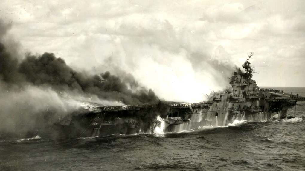 A twin-engined Japanese plane, called a Judy in naval parlance, had zoomed down from a cloud over the bow of the Franklin at seventy-five feet and dropped two bombs in quick succession. One bomb exploded in the hangar near the gasoline pumps. The other landed squarely in the middle of thirty Helldivers, gassed and loaded with bombs, on the flight deck.