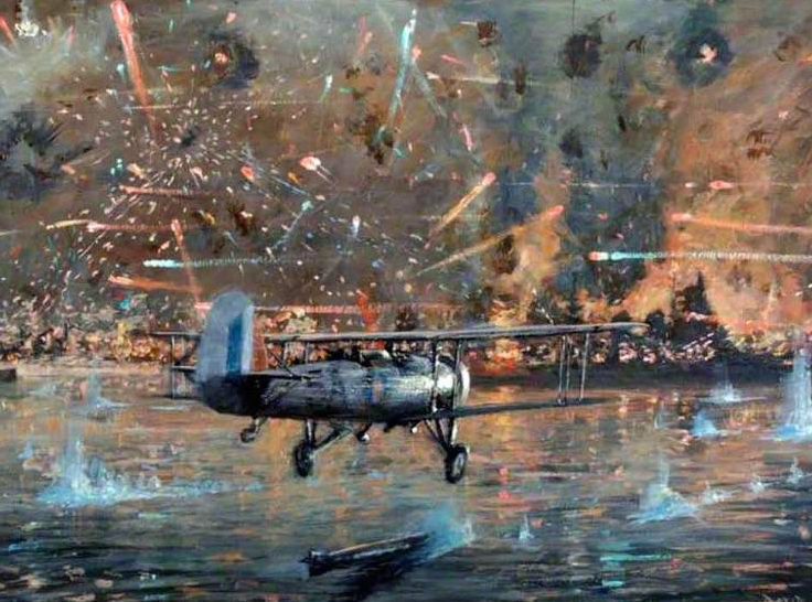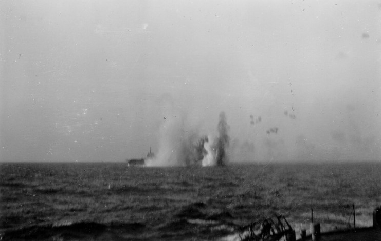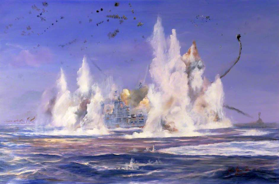 Hammering her implacably with showers of heavy high explosives, indifferent to the wholesale slaughter of those British sailors, human beings like themselves, but turned enemies by the accident of war, the Nazi pilots pressed their attack with all the concentrated fury of their fanatical desire to destroy without mercy. They had been told that it was the planes of this ship that had caused the greatest destruction among the ships of their Italian ally at Taranto.