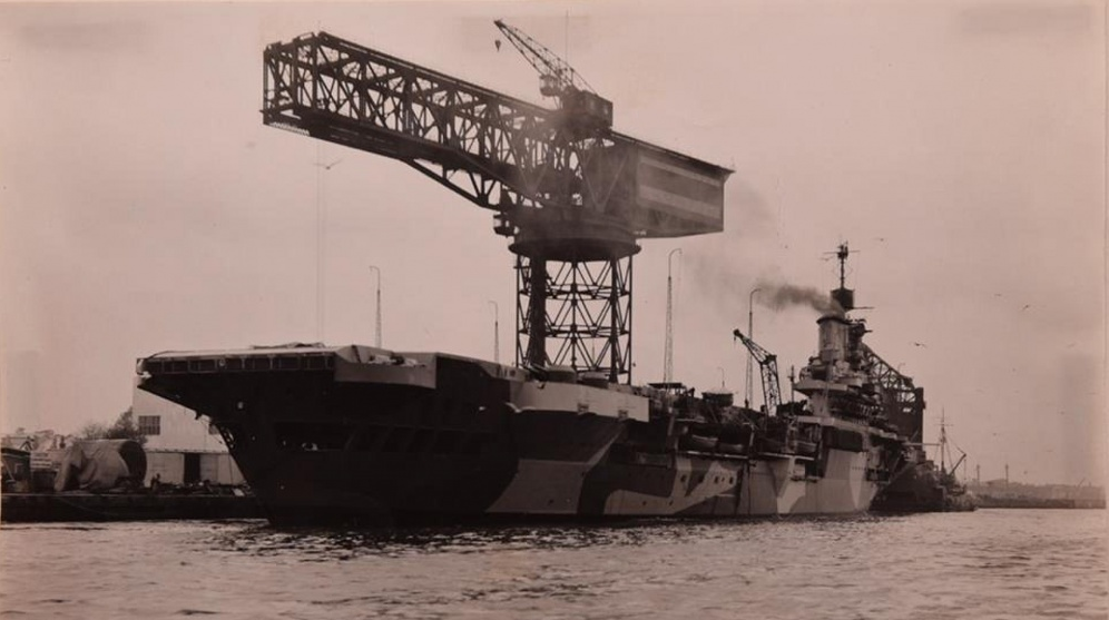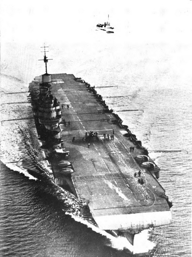 Illustrious was laid down in the yards of Vickers Armstrong at Barrow-in-Furness on April 4, 1937, as one of the big carriers budgeted for in the rearmament programme following the long sleep of the British government after the Treaty of Versailles. With a displacement of 23,000 tons, she was bigger than Ark Royal, which was completed in November 1938. Her length was 753 feet, and the width of the flight-deck 95 3/4 feet. Like her sister ships, her full complement was 1600 men. Space for seventy airplanes was provided for, though sixty was accepted as a more practical figure for operational purposes. Her defensive armament consisted of sixteen 4.5 dual purpose guns mounted on sponsons along either side, flush with the flight deck. Besides these guns she carried the usual batteries of multiple pom-poms. Japan and the United States equipped their carriers with 8-inch guns, but the Admiralty, moved by the principle that aircraft carriers should not be risked in offensive operations, had adhered to the policy of defensive armament only.