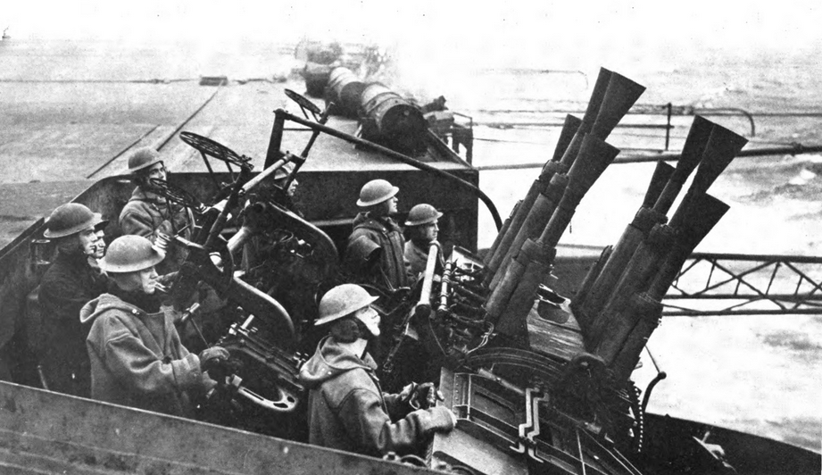 At four in the afternoon another wave of dive-bombers attacked, and it was then that a direct hit on an octuple pom-pom killed the entire crew, blowing the bodies overboard. Immediately afterwards a large bomb penetrated the overhanging flight deck at the bows, ripping up the thick steel deck as though it were a tin can, leaving a vast hole with edges curling up like the petals of some fabulous flower. The design of aircraft carriers permits of little protection to the gun crews, but for six hours the heroic gunners remained at their stations. Though blackened by smoke and deaf from concussion, they fought back, firing from their high-angle A.A. guns thousands of rounds of 4.5 shell and pom-pom ammunition. A direct hit on a pom-pom station drove the body of one of the gunners through the deck. The enemy dived to the level of the flight deck and, sweeping along the full length of the ship in the face of terrific fire, machine-gunned the pom-pom stations, killing many of the crews.
