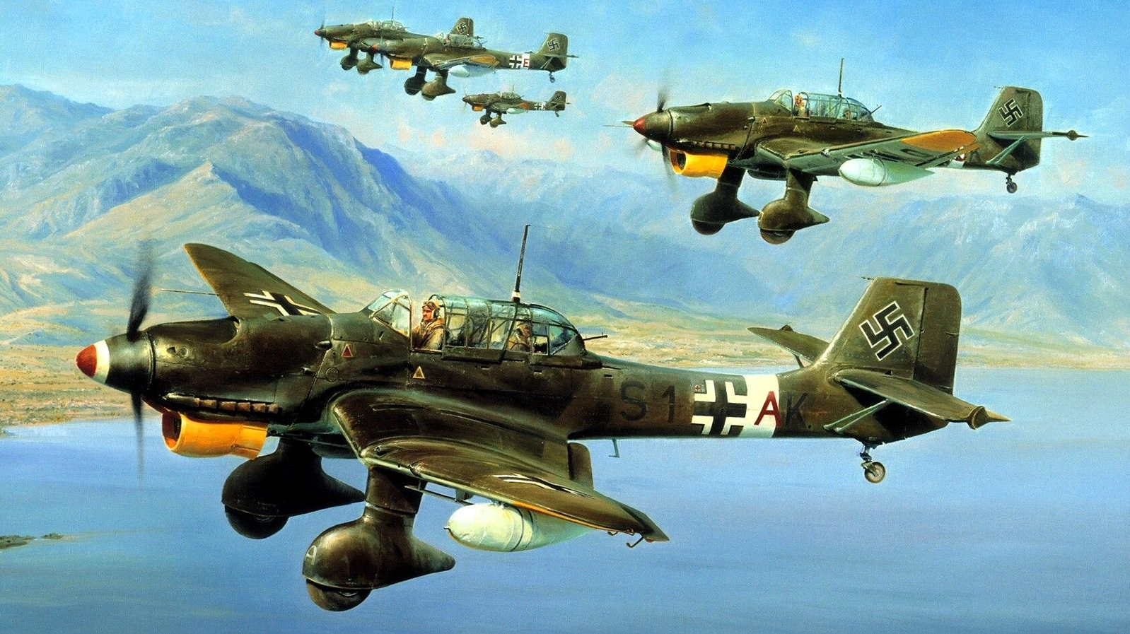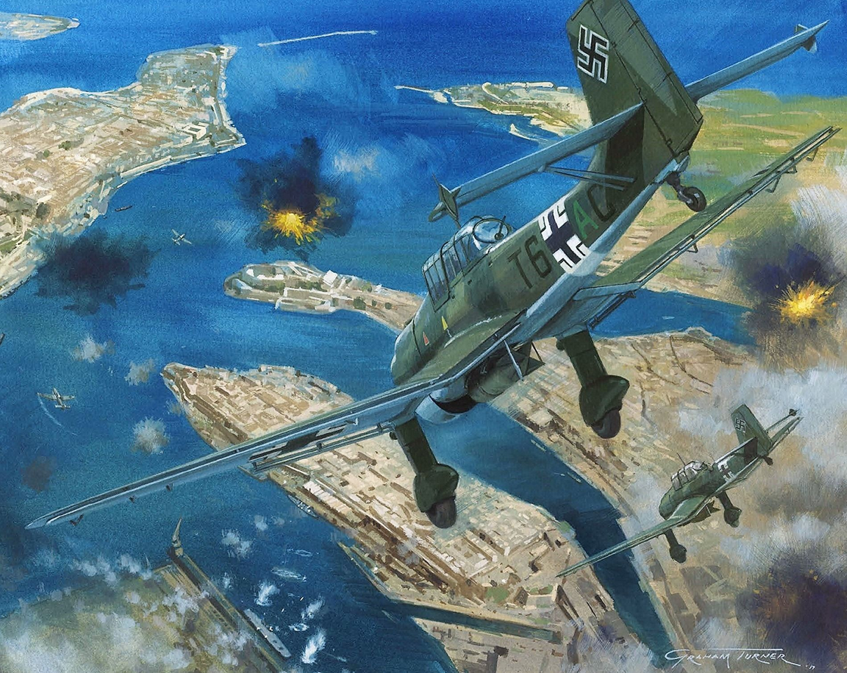 Other naval ships in the vicinity did what they could to protect the giant carrier, filling the blue Mediterranean sky with the dirty smudges of bursting A.A. shells. Watchers from the ships could see that Illustrious was taking terrible punishment and had received at least one direct hit on the flight deck by a bomb of heavy caliber. Some times the carrier was entirely blotted out by the columns of water and smoke from bursting bombs, but she was still fighting back gamely, her gunners remaining at their posts on the exposed gun platforms in spite of appalling casualties. Wave after wave of Stukas roared down on her, screaming like shells as they dived with their throttles wide open.