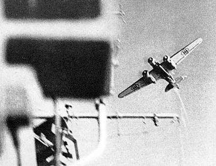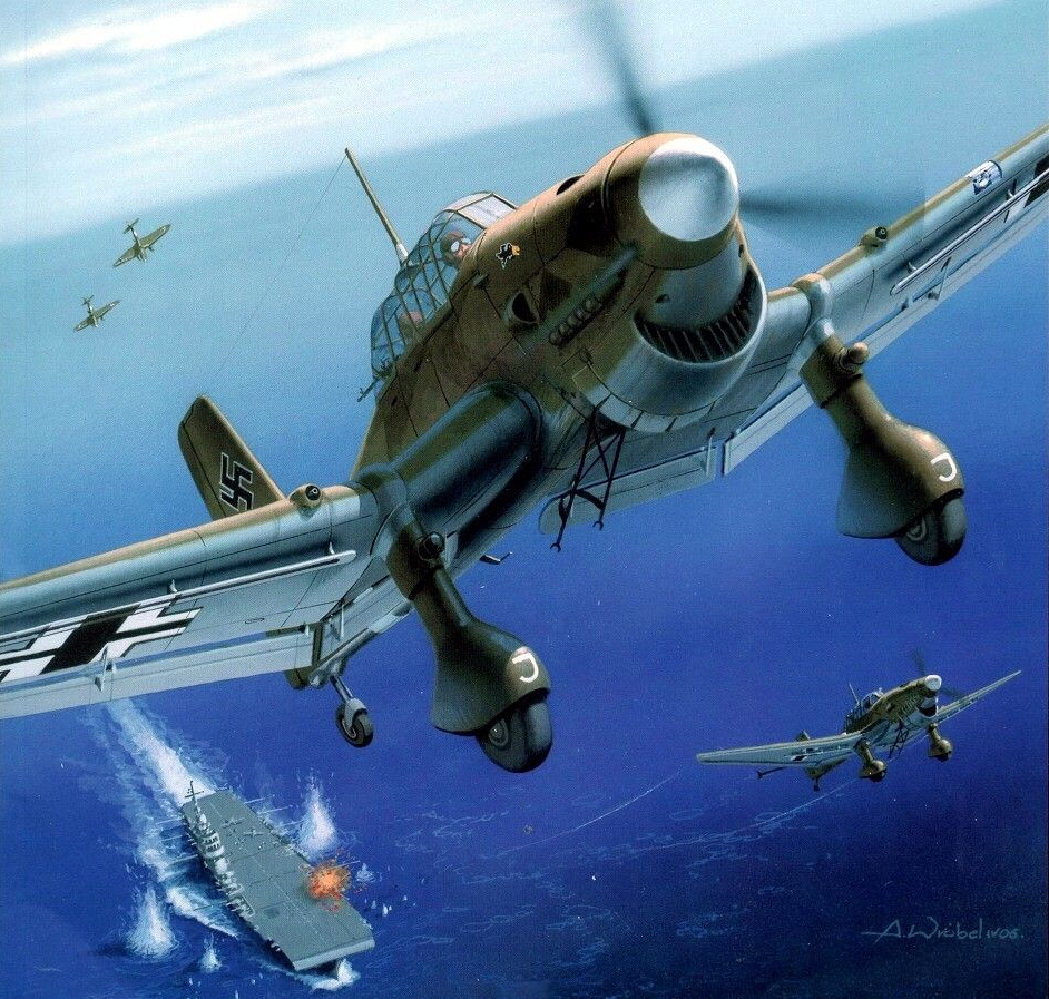 With reckless courage they came straight in, ignoring the almost solid wall of anti-aircraft shells that screamed up to stop them. With daring and skill the attack was pressed home, though planes fell out of the sky like winged ducks. Hell broke loose over and around the victim of their fury. The sea was churned up into spouting columns of water and plumed spray as the Stukas rained down a torrent of bursting steel. Goggled pilots frowning down at the oblong shape of the carrier a thousand feet below, fatalistically ignoring the vicious, spitting anti-aircraft guns, were bent almost impersonally on one relentless purpose — to destroy that hated symbol of Britain’s sea-power.