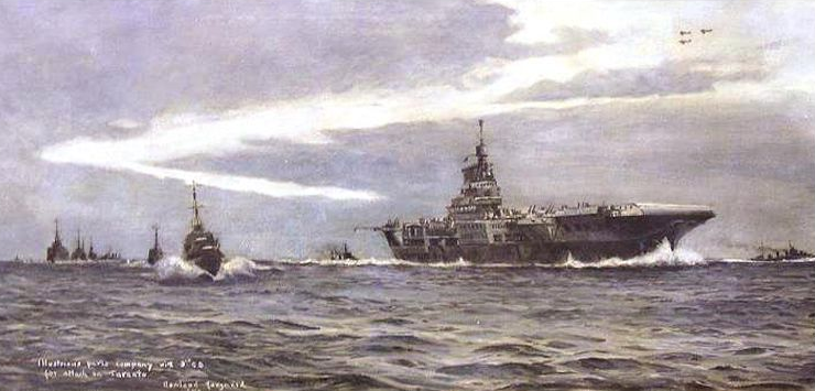 On the night of November 11–12, 1940, the great naval base inside the heel of Italy was raided by torpedo-carrying aircraft from HMS Illustrious and HMS Eagle, an old ship. It was no coincidence that this most determined attack was carried out on the anniversary of the Armistice after the World War of 1914–18. In the harbor lay the main Italian battle fleet, comprising the two new battleships Littorio and Vittorio Veneto and four others of the Cavour class as well as a number of cruisers and auxiliary craft. The attack was so carefully planned that the enemy was caught off his guard with such successful results for the Royal Navy that the balance of naval power was decisively altered in favor of Britain. In one night torpedo carrying Swordfish and Skua dive-bombers flying from Illustrious and Eagle at sea forty miles away wrought fearful destruction. The Swordfishes, coming in low over the water, dropped their torpedoes at point-blank range, leaving two battleships (one of 35,000 tons and the other of 23,000 tons) severely handled and half submerged in the harbor. Another battleship was badly damaged, and two cruisers had taken a heavy list to starboard. A daylight reconnaissance carried out the next day showed two of the Cavour class battleships to be aground, another partly submerged and abandoned, and a big 35,000-ton Littorio battleship with her stern underwater and surrounded by salvage craft. Several smaller vessels could be detected lying underwater in the inner harbor. This single raid had put out of action half the Italian battle fleet at the cost of two British planes. For the first time in war the aircraft carrier had scored a major victory, and in doing so she had thoroughly justified herself.