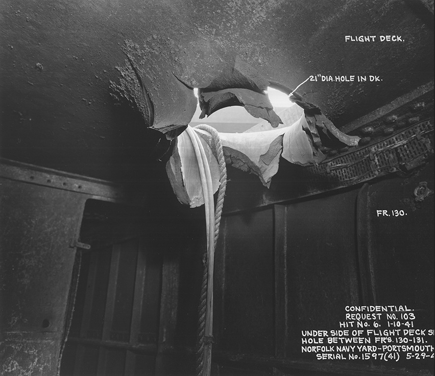 With jagged fragments of steel flying in every direction it was impossible for any of her crew to appear on deck. Still the gunners remained at their stations, though the crew of a multiple pom-pom were all killed when the gun received a direct hit from a bomb. A 1250-pound bomb, hitting the rear elevator hatch which was open and bringing up more planes, destroyed the planes and killed the crews.