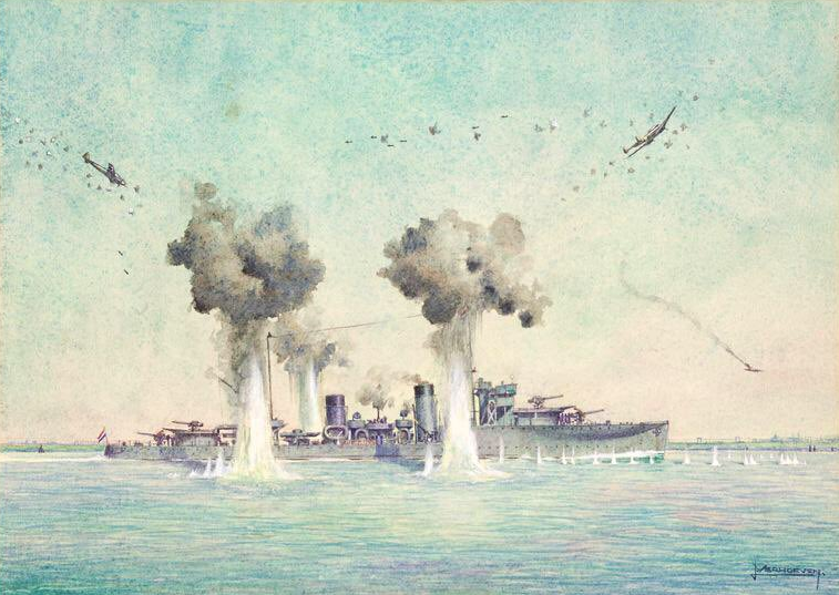 Her crew went ashore and made of themselves an army, they fought valiantly against the weight of the German forces on the South bank. But the Nieuwe Waterweg had become too dangerous, and the commander of the van Galen reported that it was impossible for the Johan Maurits van Nassau, a gunboat which had been ordered to join him, to operate there. The same considerations applied to the British destroyers which were coming in to help.