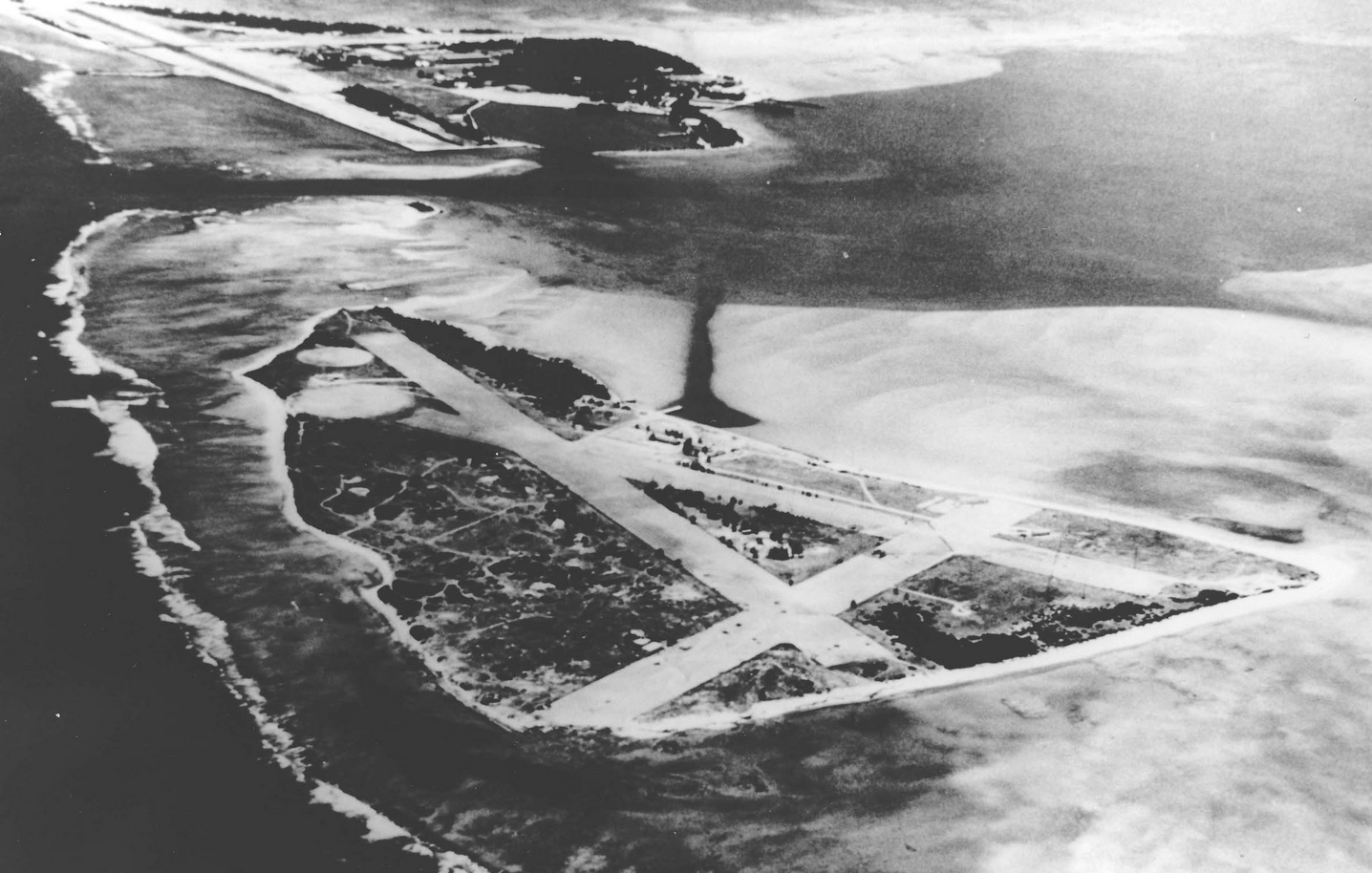 Midway Island! One and a half square miles of it. One and a half square miles of sand and coral surrounded by barbed wire and the sea; one and a half square miles of bleak and open ground, flattened by the sweeping winds, washed by driving rains, and burning beneath a tyrant sun; one and a half square miles populated only by men in uniform and a variety of pelicans; one and a half square miles of guns, guns, guns, ready and waiting to go off.