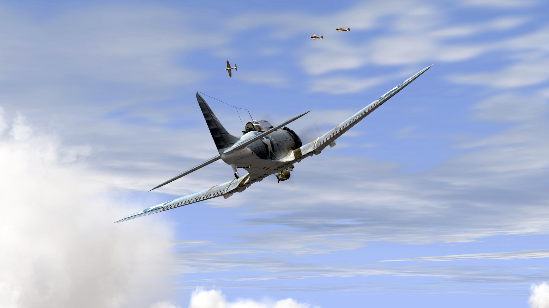 Then I saw Blaine go into his dive. Now it was my turn! I kicked left—left rudder, left aileron—stick forward. We began to dive. Damn it all to hell, here we come!
