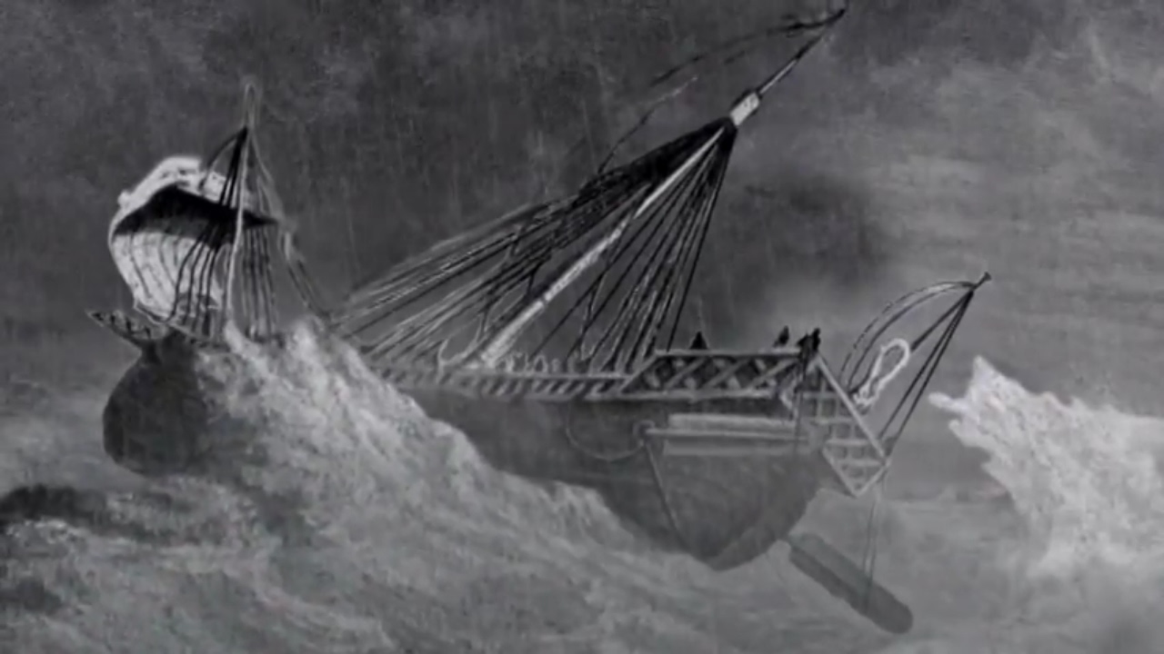 The typhonic wind drives them for a full two weeks. Luke explains (and then Smith explains the history and importance of) various measures taken by the crew. They undergird the ship with cables to hold it together. They lighten the ship by throwing such tackle as is unnecessary overboard. Without the stars to tell them where they are – and with the kitchen flooded wherein which they might prepare a meal – a sense of hopelessness arises in the crew. They must hope and pray that they can find an island to run into, or else despite their best efforts the ship will likely founder and sink.