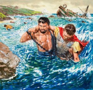 In the fourth section, the men on the ship hear land nearby – waves crashing on enormous breakers. As it is still dark they throw every remaining anchor into the sea, hoping the hold the ship in place until the sun can rise and they can pick a suitable creek into which to drive it. They steer the ship ashore in Saint Paul’s Bay on Malta where they will spend the rest of the winter. Smith here recounts the nautical terms used by Luke at the end of the journey, explains the specific method of beaching a sailing ship (with historical examples), and recounts the terrifying minute (for Paul anyway) where the Romans attempt to execute the prisoners lest they escape when everyone abandons ship. The Centurion, however, overrides custom, and all 476 men aboard scramble safely ashore.