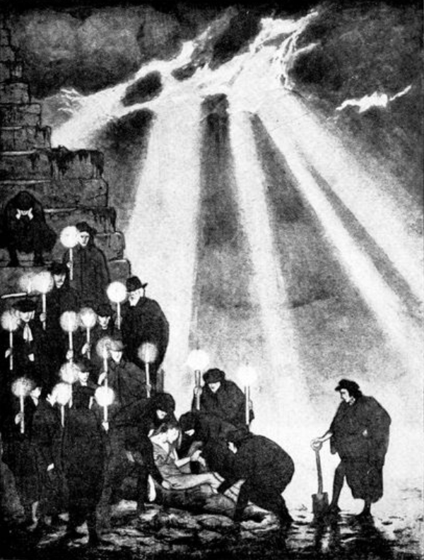 They took me down a stairway that was green with slimy things, and so came slowly to the terrible mud. There, in the territory of forsaken things, they dug a shallow grave. When they had finished they laid me in the grave, and suddenly they cast their tapers to the river. And when the water had quenched the flaring lights the tapers looked pale and small as they bobbed upon the tide, and at once the glamour of the calamity was gone, and I noticed then the approach of the huge dawn; and my friends cast their cloaks over their faces, and the solemn procession was turned into many fugitives that furtively stole away.