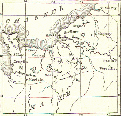 The place for the final assembling of the fleet which was to convey the expedition across the Channel was the mouth of a small river called the Dive, which will be seen upon the following map, flowing from the neighborhood of the castle of Falaise northward into the sea. The grand gathering took place in the beginning of the month of September, in the year 1066. This date, which marks the era of the Norman Conquest, is one of the dates which students of history fix indelibly in the memory.