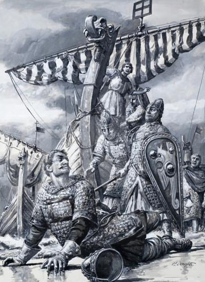 A strong body of soldiery is of course landed first on such occasions. In this instance the archers, William’s favorite corps, were selected to take the lead. William accompanied them. In his eagerness to get to the shore, as he leaped from the boat, his foot slipped, and he fell. The officers and men around him would have considered this an evil omen; but he had presence of mind enough to extend his arms and grasp the ground, pretending that his prostration was designed, and saying at the same time, “Thus I seize this land; from this moment it is mine.” As he arose, one of his officers ran to a neighboring hut which stood near by upon the shore, and breaking off a little of the thatch, carried it to William, and, putting it into his hand, said that he thus gave him seizin of his new possessions. This was a customary form, in those times, of putting a new owner into possession of lands which he had purchased or acquired in any other way. The new proprietor would repair to the ground, where the party whose province it was to deliver the property would detach something from it, such as a piece of turf from a bank, or a little of the thatch from a cottage, and offering it to him, would say, “Thus I deliver thee seizin,” that is, possession, “of this land.” This ceremony was necessary to complete the conveyance of the estate.