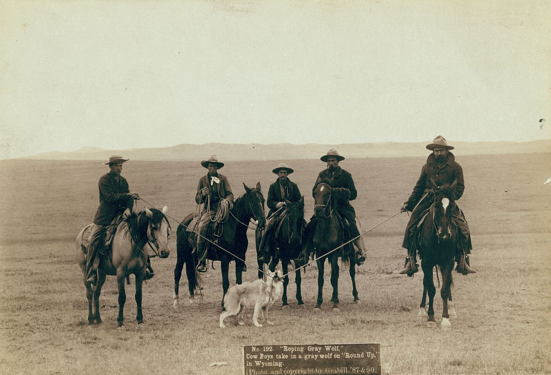 Formerly wolves were incredibly abundant in certain parts of the country, notably on the great plains, where they were known as buffalo wolves, and were regular attendants on the great herds of the bison. Every traveller and hunter of the old days knew them as among the most common sights of the plains, and they followed the hunting parties and emigrant trains for the sake of the scraps left in camp. Now, however, there is no district in which they are really abundant. The wolfers, or professional wolf-hunters, who killed them by poisoning for the sake of their fur, and the cattlemen, who likewise killed them by poisoning because of their raids on the herds, have doubtless been the chief instruments in working their decimation on the plains. In the ’70’s, and even in the early ’80’s, many tens of thousands of wolves were killed by the wolfers in Montana and northern Wyoming and western Dakota. Nowadays the surviving wolves of the plains have learned caution; they no longer move abroad at midday, and still less do they dream of hanging on the footsteps of hunter and traveler. Instead of being one of the most common they have become one of the rarest sights of the plains. A hunter may wander far and wide through the plains for months nowadays and never see a wolf, though he will probably see many coyotes. However, the diminution goes on, not steadily but by fits and starts, and moreover, the beasts now and then change their abodes, and appear in numbers in places where they have been scarce for a long period. In the present winter of 1892-’93 big wolves are more plentiful in the neighborhood of my ranch than they have been for ten years, and have worked some havoc among the cattle and young horses. The cowboys have been carrying on the usual vindictive campaign against them; a number have been poisoned, and a number of others have fallen victims to their greediness, the cowboys surprising them when gorged to repletion on the carcass of a colt or calf, and, in consequence, unable to run, so that they are easily ridden down, roped, and then dragged to death.