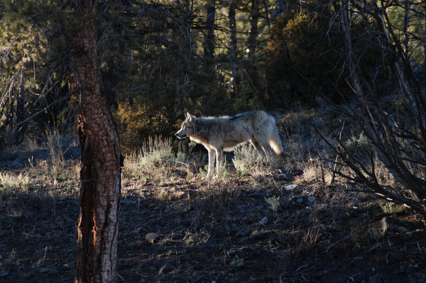 Five or six times on the plains or on my ranch I have had shots at wolves, always obtained by accident and always, I regret to say, missed. Often the wolf when seen was running at full speed for cover, or else was so far off that though motionless my shots went wide of it. But once have I with my own rifle killed a wolf, and this was while travelling with a pack train in the mountains. We had been making considerable noise, and I never understood how an animal so wary permitted our near approach. He did, nevertheless, and just as we came to a little stream which we were to ford I saw him get on a dead log some thirty yards distant and walk slowly off with his eyes turned toward us. The first shot smashed his shoulders and brought him down.